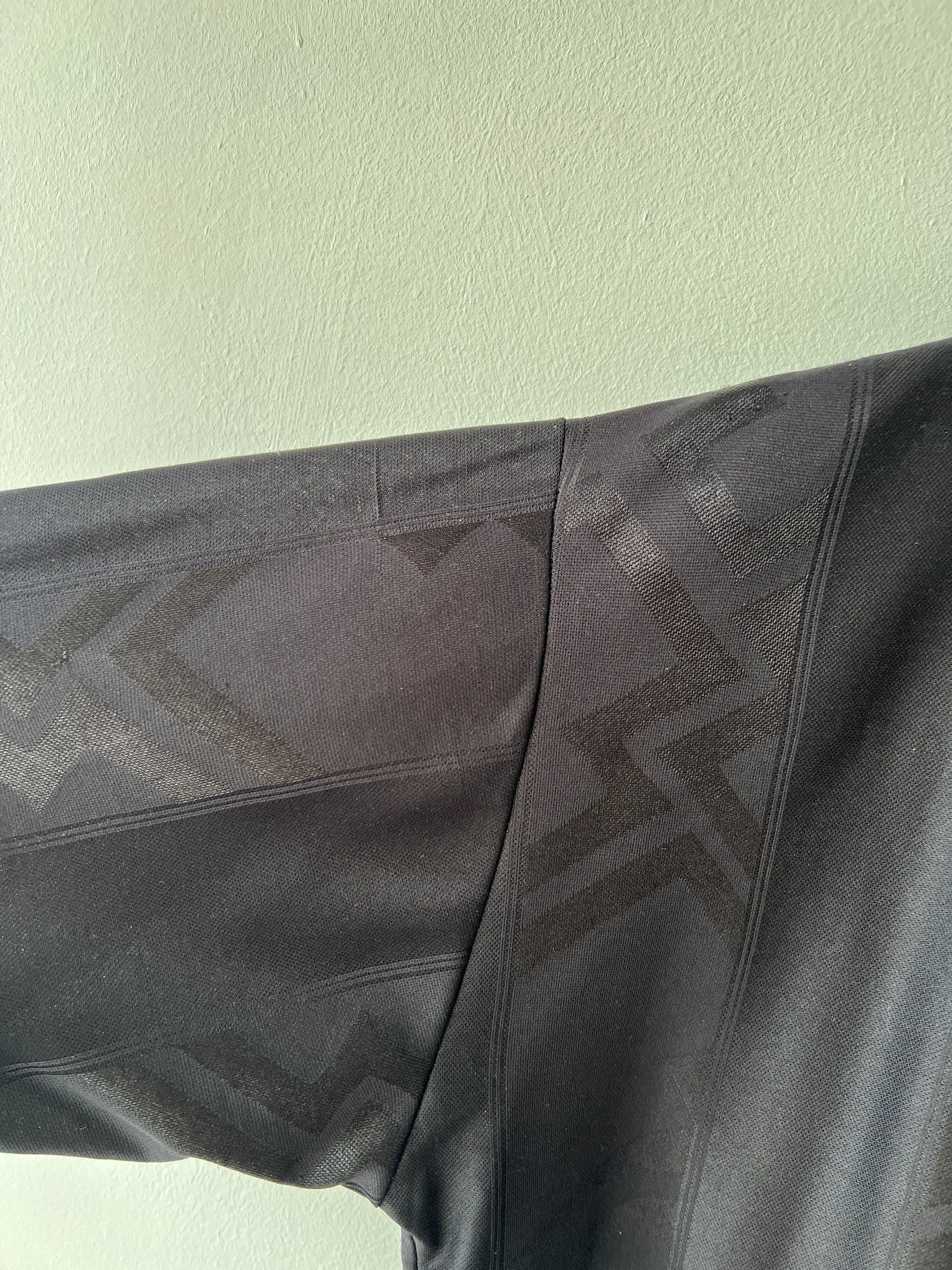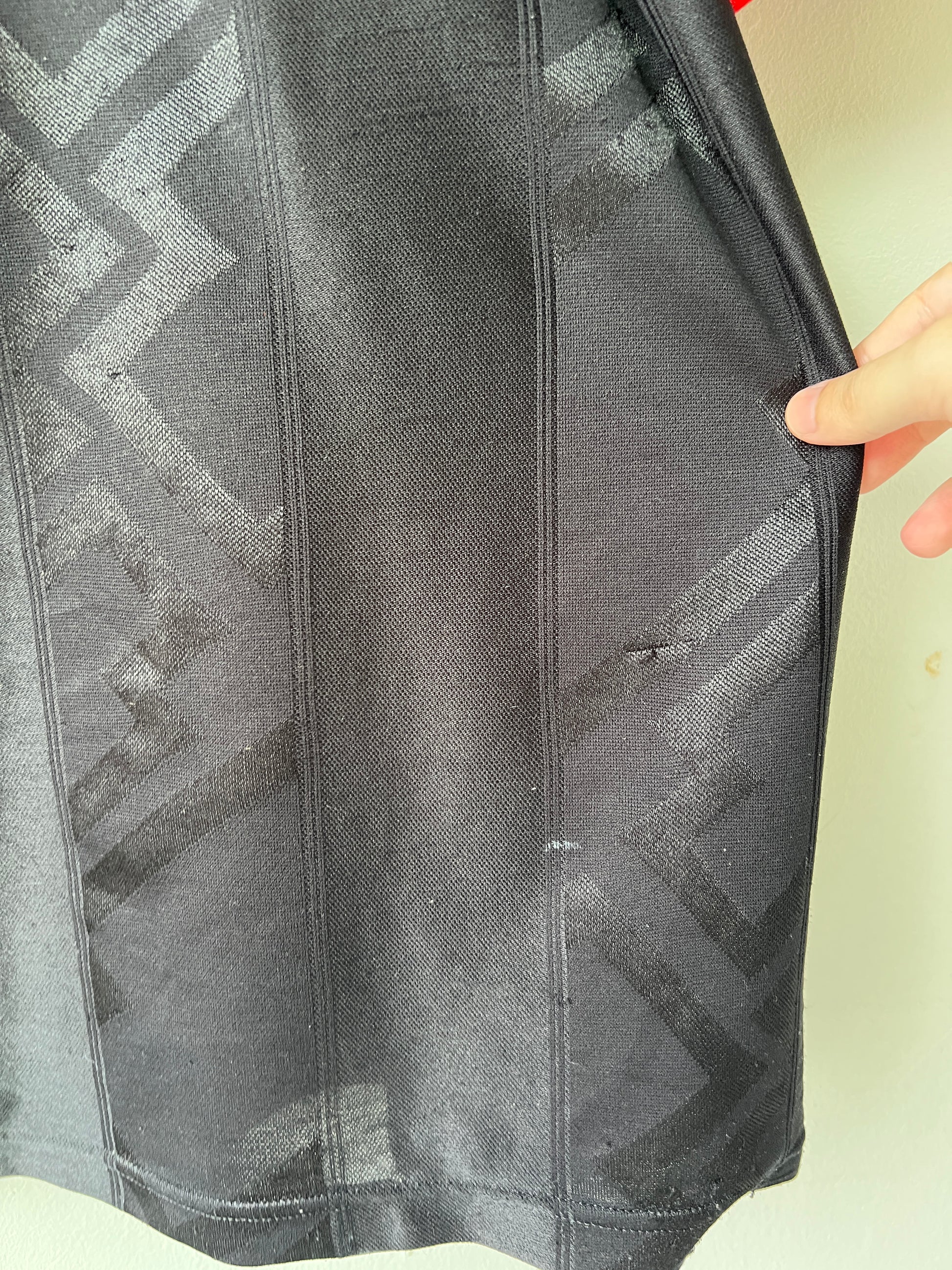 Defects: Tiny bobbles and pulls throughout (not visible due to dark colour of shirt)